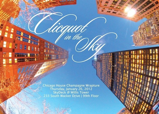 Chicago House's top winter event has finally reached the highest high! On the 99th floor of the Willis Tower, high flying treats and bubbly drinks await you!  Soar to new heights and join Veuve Clicquot and Co-Chairs David Kaufman, Tom Segal, Matthew Harvat, Dennis Remer, Scott Silverman, and Christopher Hubbard for Champagne Wrapture 2012: Clicquot in the Sky. New this year, when you purchase the VIP Ticket for Champagne Wrapture receive a VIP Gift Pack that includes surprises from Garrett Popcorn, Terry's Toffees and Sweet Miss Giving's Bakery. Plus, you will receive a commemorative SkyDeck photo taken on The Ledge! For further information please call (773) 248-5200 x303 for more information.