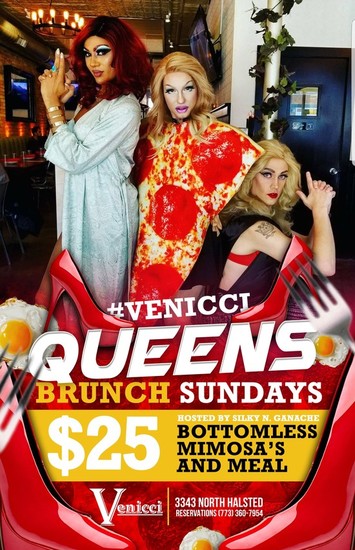 Brunch begins every Sunday with live entertainment starting at 1 p.m. $25 all you can drink mimosas, one brunch entrée and plenty of fun. Join the Venicci Queens every Sunday for all you can drink mimosas and music and dancing! Live entertainment hosted by drag queen Silky N. Ganache and featuring rotating special guests.