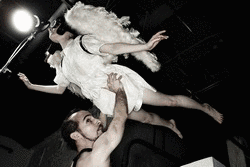 David Catlin, as director, and choreographer Sylvia Hernandez-DiStasi get the credit for the beautiful flights of actresses suspended from long skeins of fabric, and for Mr. Catlin's sometimes artful directorial depiction of ancient legend. But as the author, David Catlin must take all the blame for the turgid prose that drags everything back to Earth again and again. Why the two Mr. Catlins never really stepped back to study what they were hearing on stage is anyone's guess. The often dull show does have a couple of anti-fugues, where actors in lab coats have compelling, overlapping modern speeches (doctors' notes, really)—but otherwise, it's a filigreed and round-about affair: whether lithe performers are floating in circles above the stage, or just forced to make circuitous and forgettable comments about their plight.
