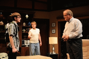 The play's premise is solid enough. It's a variant on the classic structure of an antagonist coming into a group and upsetting the order. The twist here is that there's not much order in the family he visits anyway. Following his release from prison, Doug, having no place else to live, crashes at his sister's home in suburban Chicago. The sister is out of town on a business trip, though, leaving Doug alone with her husband Phillip (Francis Guinan) and their troubled gay teenaged son. Doug's never really gotten along with Phillip, a prissy, obsessive-compulsive sort. Phillip recently lost his job over unproven allegations of theft, and his marriage to Sheila (Meg Thalken) is seriously on the rocks. Son Andrew (Bubba Weiler) is a geeky, super-smart kid who is taunted so horribly at school that he's begun to skip regularly and says he thinks of suicide every day.