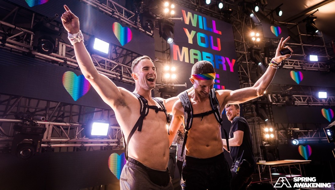 Pictured: Chicagoans Dusty Carpenter and Sam Albright get engaged on stage in front of Spring Awakening crowd of about 2,500