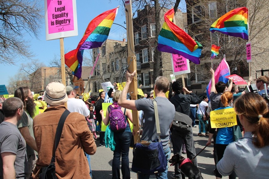 Saturday, April 27, 2013 - Supporters of equal marriage rights for same-sex couples held a counter-protest against a rally led by the anti-gay Illinois Family Institute (IFI). The protest started at Palmer Square Park, 2200 N. Sacramento Ave., before spilling out onto Humboldt Blvd. and through the Logan Square and Humboldt Park neighborhoods. (Read more)