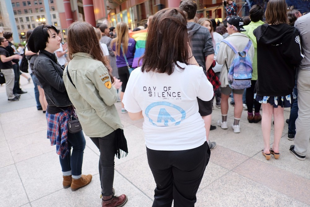Friday, April 17, 2015 - Hundreds of Gay/Straight Alliance (GSA) students from schools across Chicago gathered Friday to conclude the Day of Silence, which protests the bullying of lesbian, gay, bisexual, transgender, questioning, and allied (LGBTQA) youth, as the Illinois Safe Schools Alliance hosted their annual Night of Noise rally in downtown Chicago.